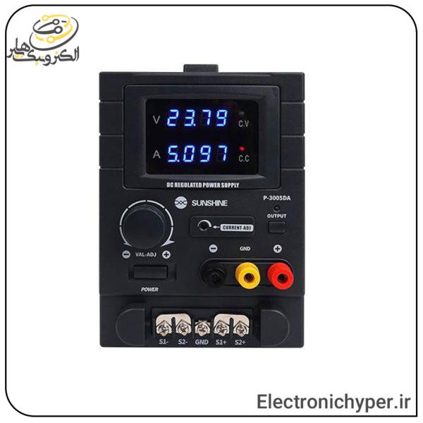 ویژگیهای منبع تغذیه سانشاین P3005da : مقدار ولتاژ و جریانی که میتواند برای بار مصرفکننده خود تأمین کند میزان پایداری ولتاژ یا جریان خروجی در شرایط بار مختلف دارای دو نمایشگر LED چهار بیتی دیجیتالی برای نمایش مقادیر قابلیت اندازه گیری واحد ها تا سه رقم اعشار قابلیت تنظیم خودکار ولتاژ دستگیره پلاستیکی جهت جا به جایی آسان دستگاه قابلیت اتصال همزمان سه دستگاه بدنه فلزی آنتی استاتیک دارای پراب سوسماری